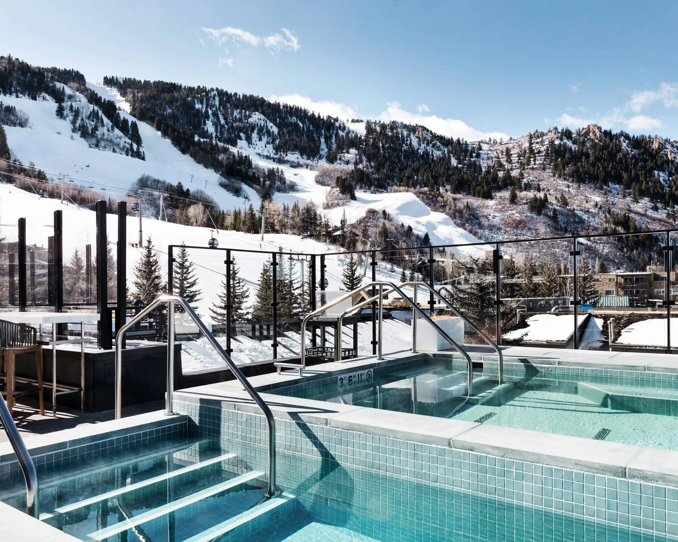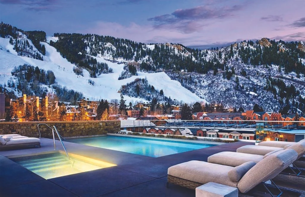 Located at the base of Aspen Mountain, the W Aspen offers a contemporary, social-forward take on the alpine experience. The interiors are bold and design-conscious, and the hotel’s rooftop Wet Deck remains one of Aspen’s most active gathering spaces during the season — with panoramic mountain views, fire features, and a lively après-ski atmosphere.